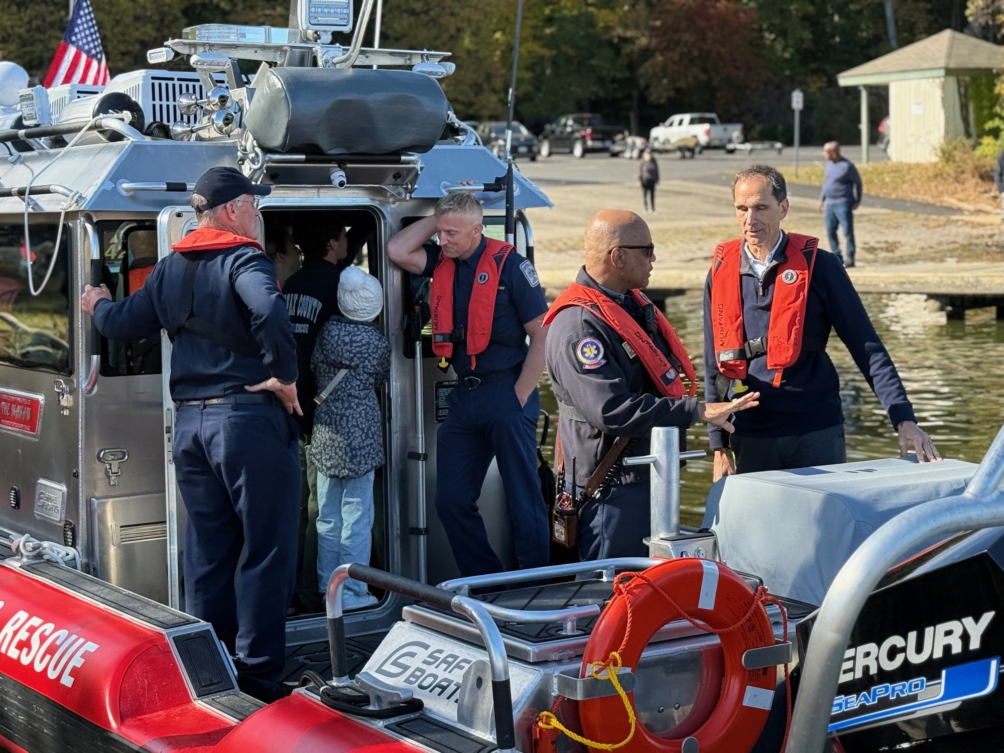 Supervisor Dan Storck speaks with Fire Chief John Butler as they push away from the docks in Pohick.
