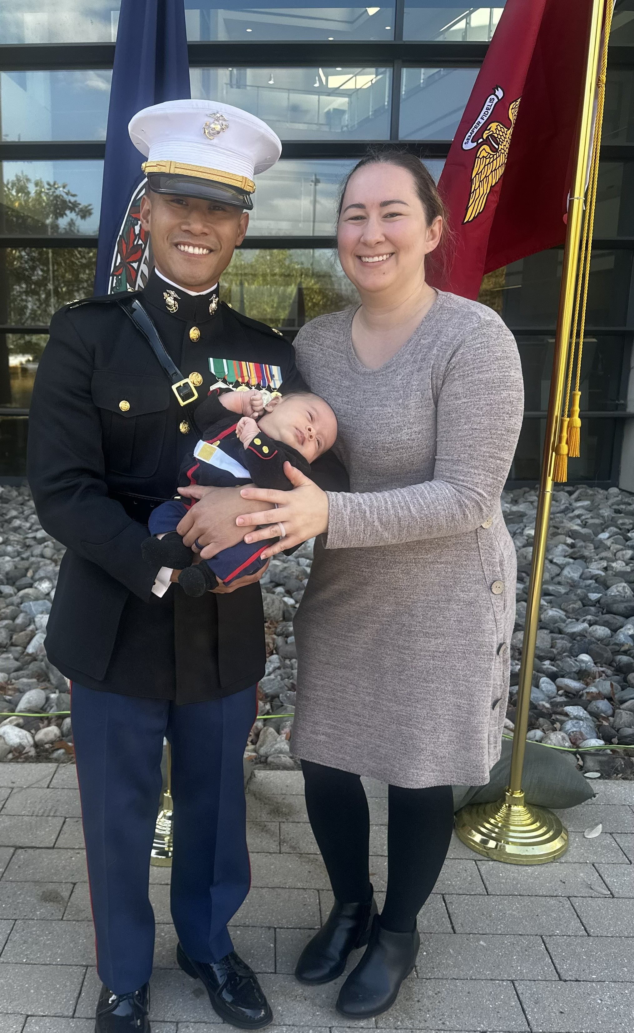 APD Officer and Marine Corps reservist Neale Marquez with Courtney Marquez and their new baby at the Nov. 12 APD ceremony celebrating the 250th birthday of the United States Marine Corps.