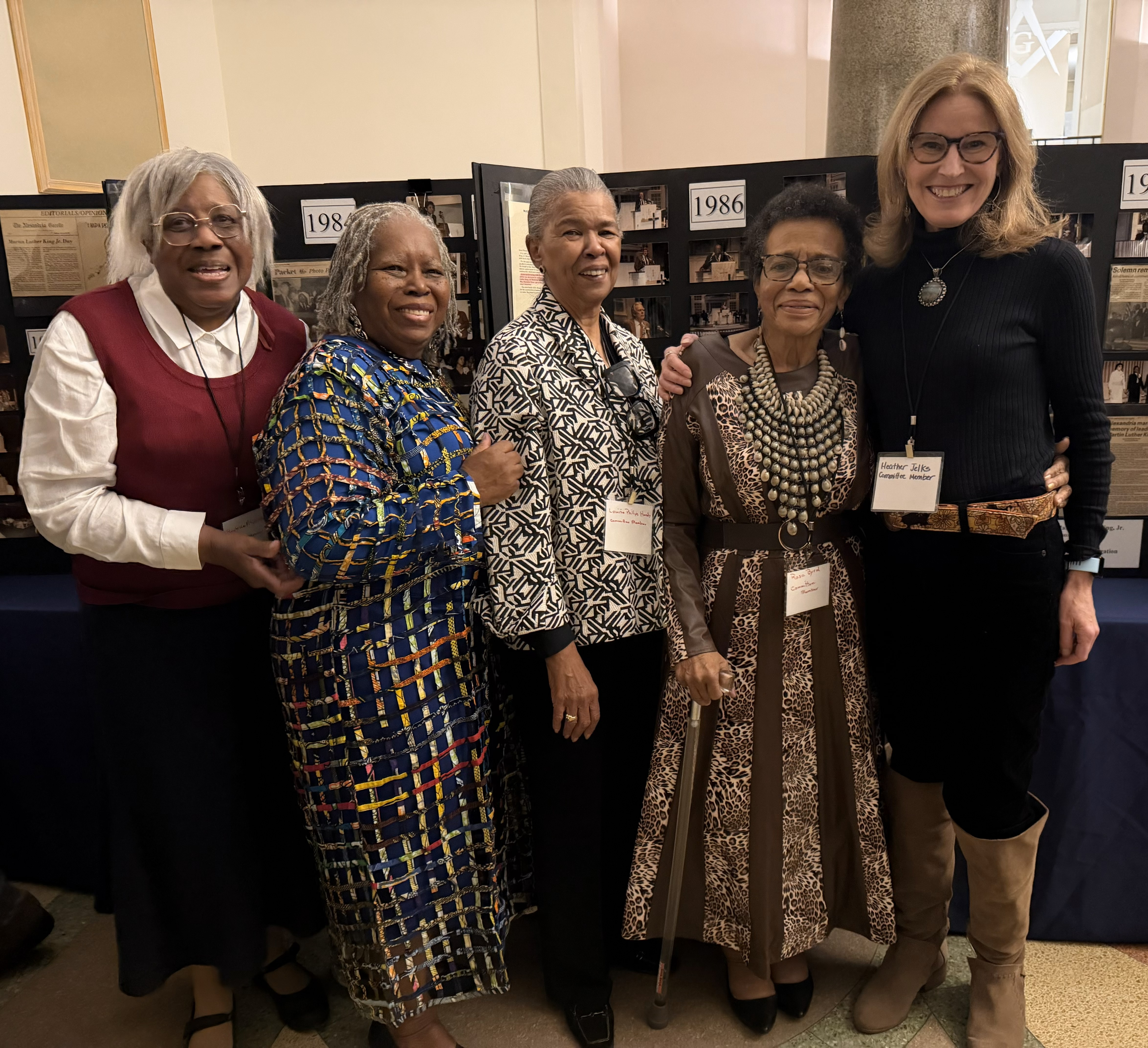 MLK Day committee members Beatrice McGuire, Ellen Nelson, Louise Phillips, committee chair Rosa Byrd, and Heather Jelks pose in front of a display honoring Martin Luther King. Jr. Jan. 15 at the George Washington Masonic National Memorial.